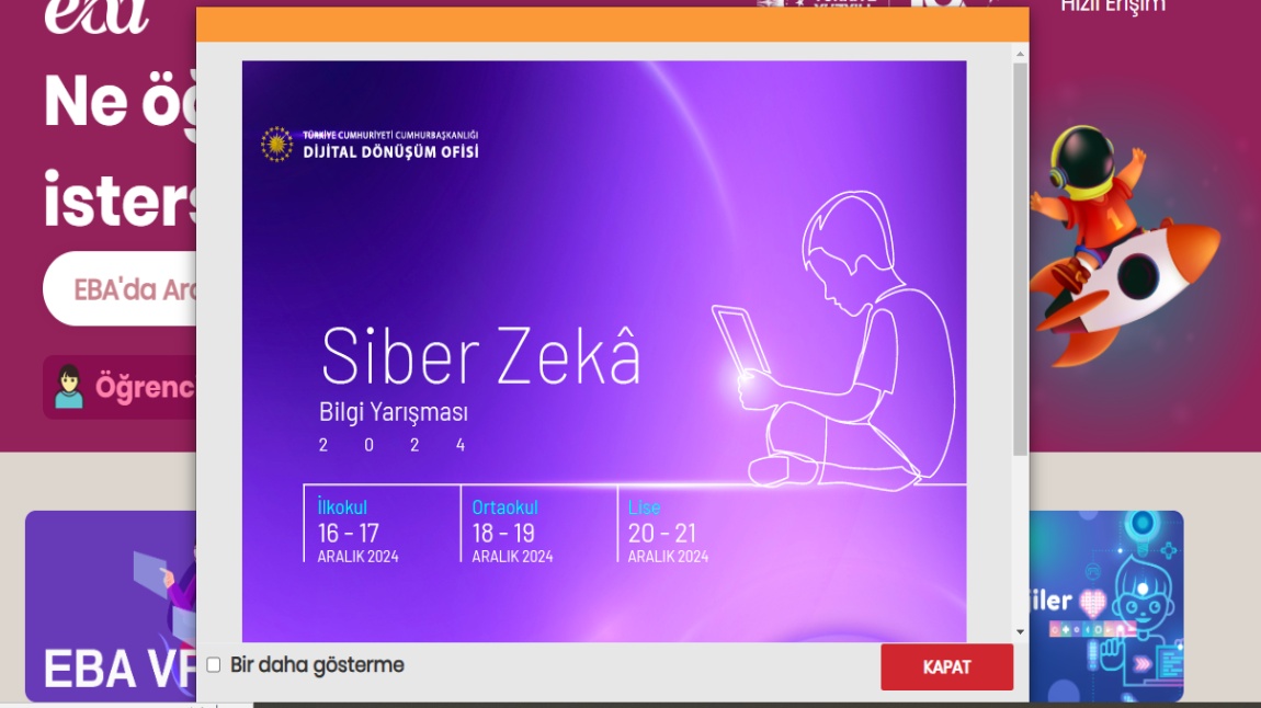 Öğrencilerimiz, 18-19 Aralık 2024 tarihlerinde bu adresten başvuru formunu doldurarak; siber güvenlik konularını kapsayan Siber Zekâ Testi'ne katılabilirler. En çok doğru cevabı en kısa sürede veren öğrencilerimiz Cumhurbaşkanlığı Dijital Dönüşüm Ofisi tarafından hazırlanan sürpriz hediyelerin sahibi olacak. Sonuçları, Ofisin sosyal medya hesaplarından takip edebilirsiniz.